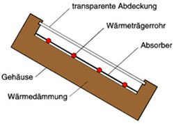 Flachkollektoren Sie haben einen flächigen Absorber, der in einem gut wärmegedämmten Gehäuse mit einer transparenten Abdeckung eingebettet ist.